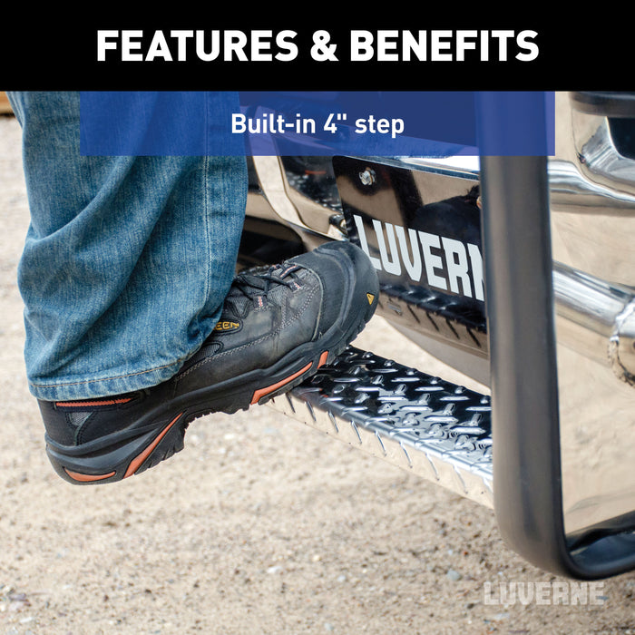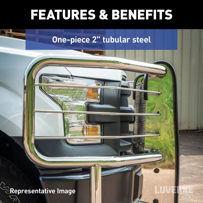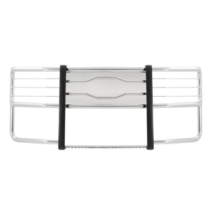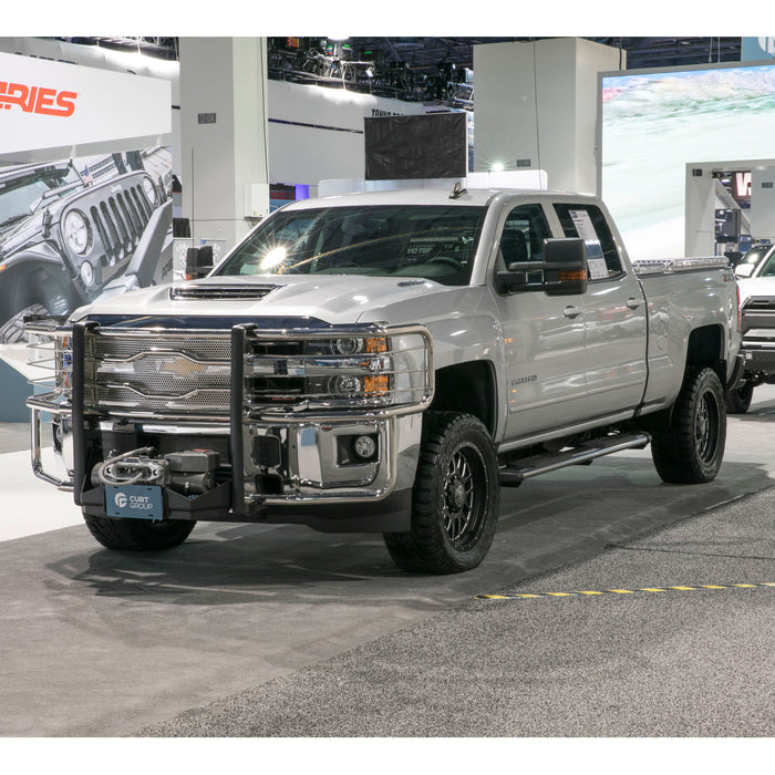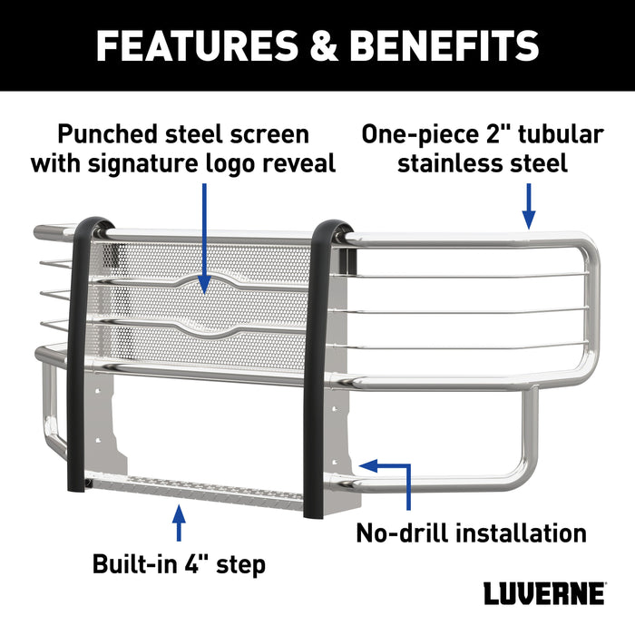 Basic. Standard. Stock. Some words were never intended to describe your truck, and it takes a certain type of hardworking truck accessory to meet your expectations. The LUVERNE Prowler Max grille guard equips your truck to tackle the toughest of jobs with its uncommon construction, comprehensive protection and arsenal of extra features. It begins with a bold, punched steel screen center section. This heavy-gauge mesh not only adds style to the Prowler Max but also increases protection for your grille, shielding it from rocks, debris and other threats. The center section features our signature logo reveal with contoured horizontal tubes to add even more protection and increase structural stability. Below the center section is a built-in 4" wide step with non-skid, diamond treads. The step blends perfectly with the grille guard and provides easier access when working under the hood, particularly on large, full-size pickup trucks. The Prowler Max grille guard also distinguishes itself with its vehicle-specific wraparound ring assembly. The double-stacked side brush guards uniquely contour to the front end of each truck application and feature 3/8" wires for increased headlight protection. This particular custom truck grille guard fits specific years of the GMC Sierra 2500 HD and 3500 HD (see fitment info to verify). To give it the muscle to stand behind its attitude, we construct the Prowler Max from one-piece, 2" diameter tubular steel. Its heavy-duty uprights bolt directly to the frame of the truck, using high-strength steel brackets and a no-drill installation (NOTE: Brackets for attaching this grille guard are included but shipped separately). To finish things off, the Prowler Max truck grille guard is available in two finish options. The E-coat and black powder coat finish offers maximum durability, while the high-polish stainless steel provides a bright, no-rust shine.