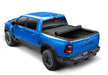The BAK Industries Revolver X4s truck bed cover features a complete matte-black finish, ensuring a sleek and consistent appearance. This design extends across all components, from the mounting brackets and clamps to the hardware and aluminum slats. Whether open or closed, it exudes a subtle sophistication, seamlessly integrating into any environment. Such attention to detail underscores the product's dedication to both style and practicality.