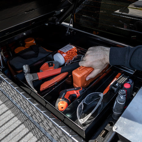 Every Buyers Crossover box comes with a lockable tray. Each tray includes three removable dividers to organize your gear with flexibility and an integrated screwdriver and level holders.