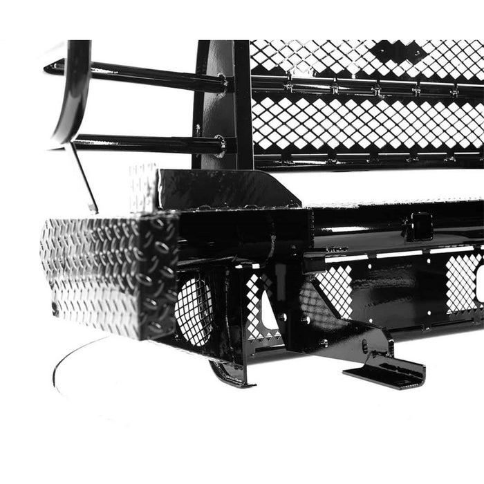 This frame mounted one-piece welded bumper provides maximum wraparound protection, strength & durability. The Legend front bumper features a wrap-around full grille guard, with 5/16" uprights and 12-gauge perforated steel inserts. Each bumper uses thick diamond plate steel construction and 4-1/2" schedule steel pipe, spanning the front of the truck.