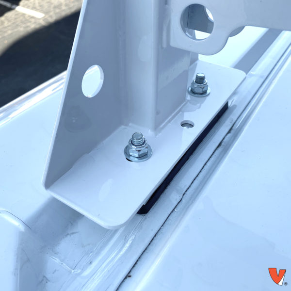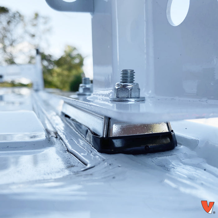 Vantech H1 van rack crossbars have a non-slip plastic bar guard on top, preventing ladders and gear from shifting. Mounting uprights are 8" at the base with a 10.5" height, using rubber caps to prevent wind noise and water leakage. Completely welded to the upright post, the base of the van rack features a complete seal.