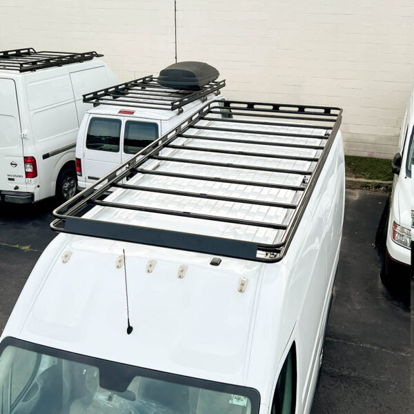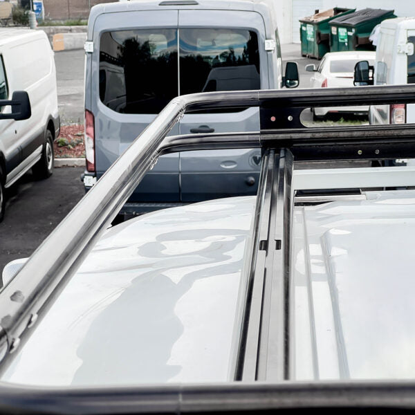 Constructed of heavy-duty aluminum, Vantech's 2.1 series cargo rack system carrying up to 750 pounds of ladders & gear. The van cargo rack is great for hauling big loads for both commercial and recreational uses. The side-rail accessory slots accommodate third-party gear such as awnings and water tanks. A strong design permits low-profile mounting bases, leaving the cargo rack low and close to the roof line.